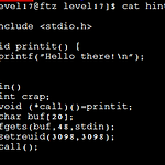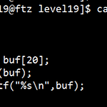 이번에도 함수 포인터 문제인데 조금 다르다 다른 함수 뭐 이런 것이 없고 setreuid로 권한을 올린다음에 call()을 호출한다 뭐지? 그리고 call의 포인터로 printit()함수를 실행한다 함수 내용은 볼게 없다 음…. 그래서 생각한 것인데 함수 포인터도 포인터이다 그냥 BOF처럼 공격하면 그것을 실행하지 않을까? 그러기 위해 우선 스택 구조부터 살펴보자 보아 하니 전단계의 스택과 똑같다고 생각한다 그렇다면 스택은 다음과 같다 buf[20] | dummy(20) | call *(4) | dummy(12) | SFP(4) | RET(4) 우리는 기본적인 BOF를 사용할 생각이다 Buf에 쉘코드를 넣으려 했지만 ASLR때문에 그게 여의치 않다 그래서 환경변수에 쉘코드를 넣고 그 주소를 call에 담..